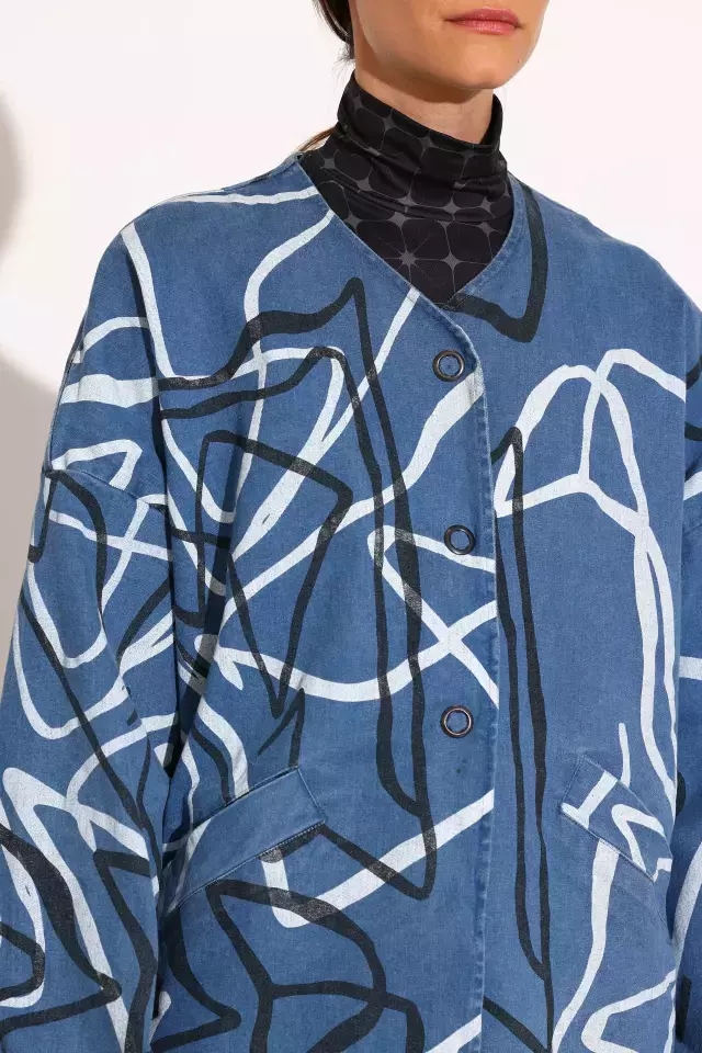 Capa Vaiven, confeccionada en denim elastizado. Campera midi manga larga con elástico en el puño, dos bolsillos ojal en el frente y canesú con una maxi pinza. Cierre frontal con tres broches arandela a presión. Vivos de denim como terminación de la prenda. La prenda tiene una estampa full inspirada en la obra de la artista de esta colección Martina Elisa.