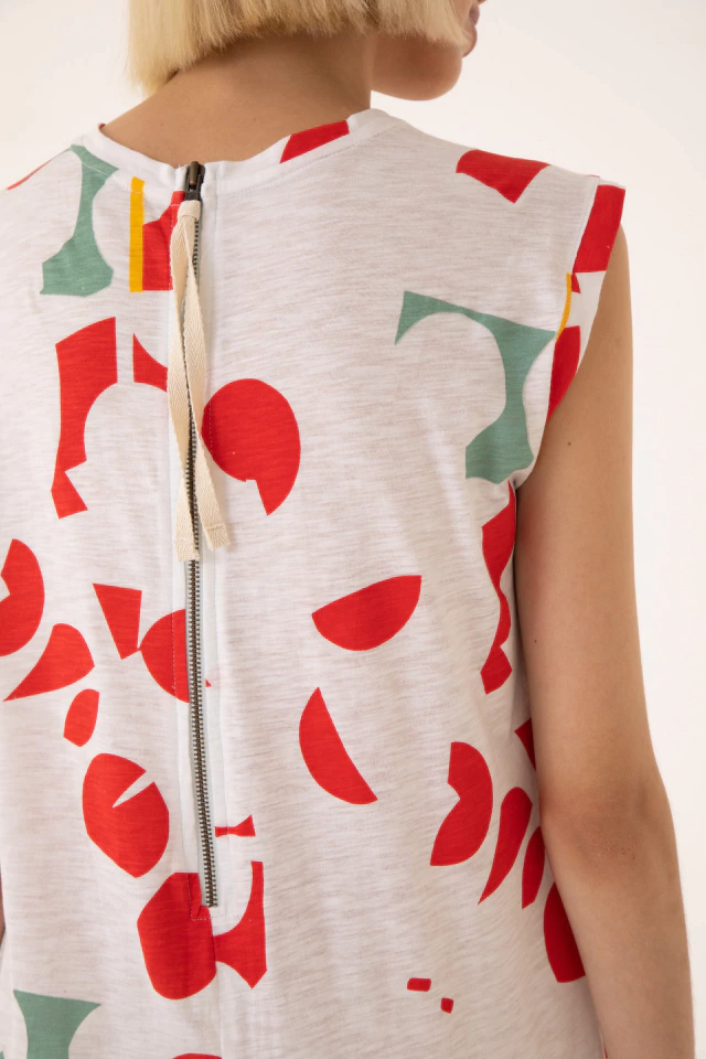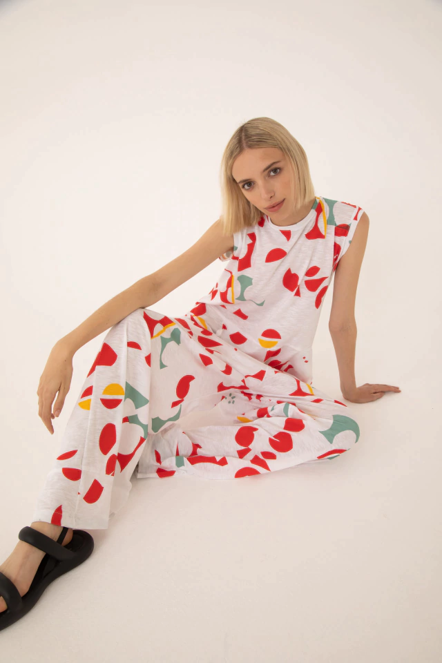 Mono confeccionado 100% en flame (algodón pima). Cuello redondo, bolsillos en laterales y cierre en la espalda como sistema de cierre. Estampado full en serigrafía. Cómodo y fresco para usar en verano!