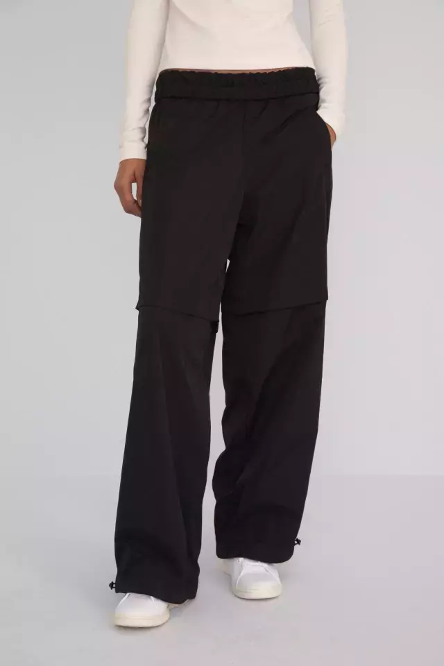 Pantalón God, confeccionado en un género con textura similar a un impermeable. Se destaca por su diseño innovador. Incorpora un cierre lateral, pinzas y un recorte estratégico a la altura de las rodillas. El puño se ajusta con elástico y trancas, contribuyendo así a la forma redonda característica de esta colección.