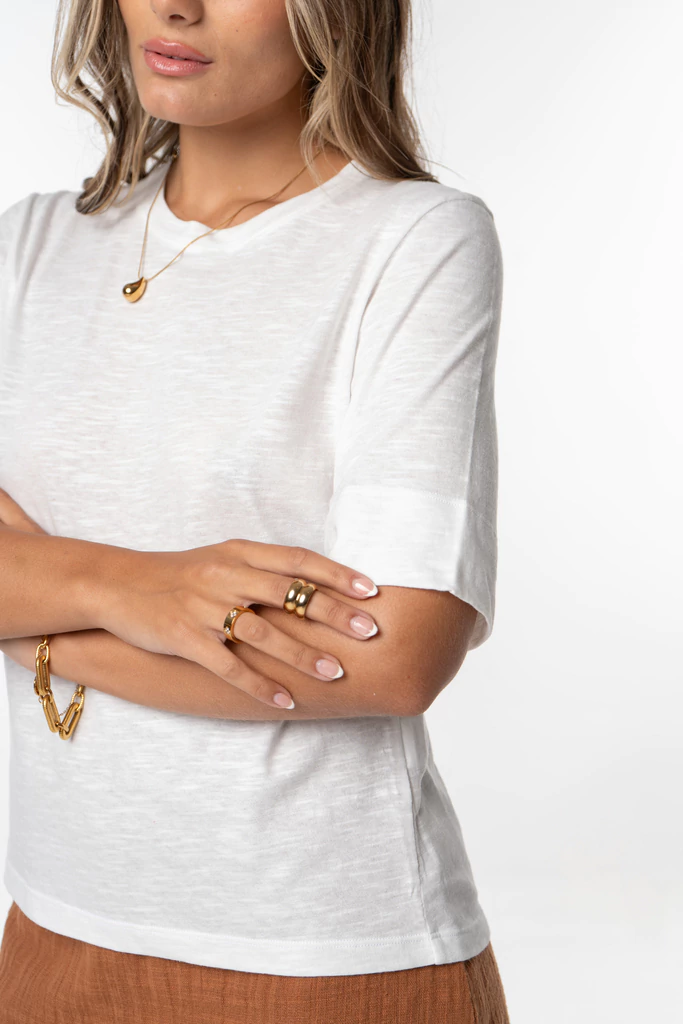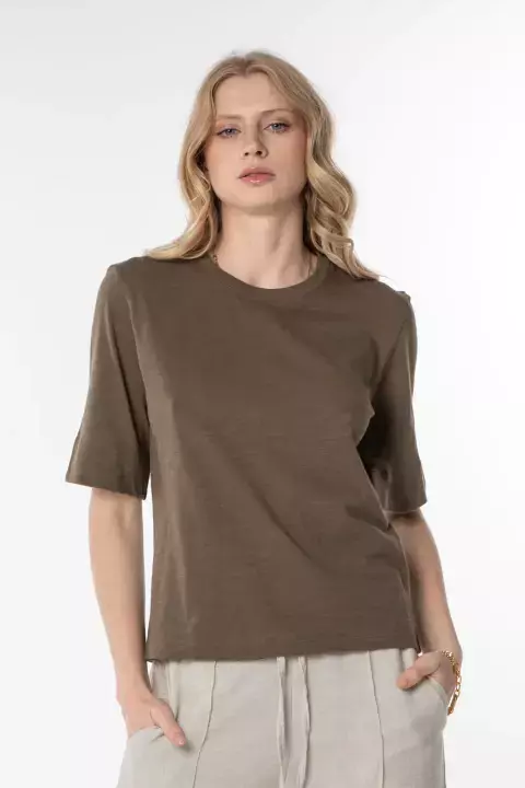 Remera de algodón flame 100%, con manga por encima del codo y calce relajado